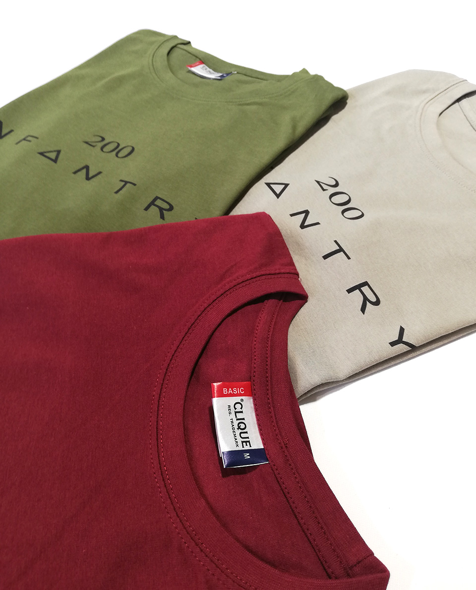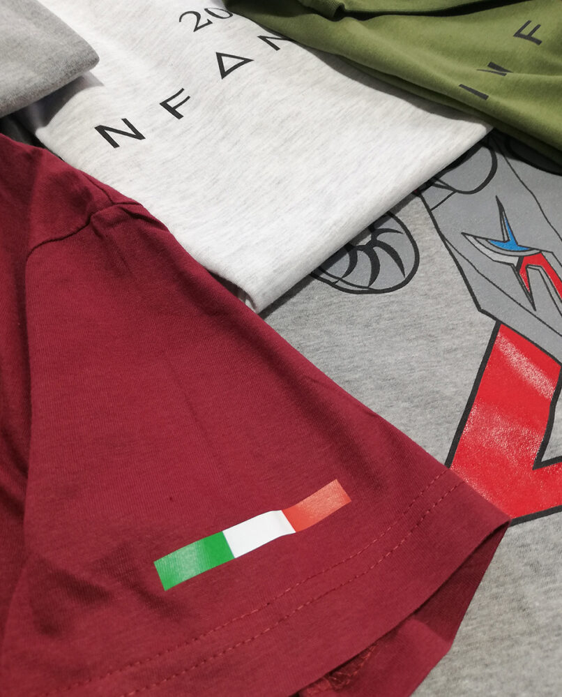 Abbigliamento promozionale. Personalizzazione di tee-shirt in cotone premium. Stampa serigrafica sul fronte e retro della maglietta, applicazione pellicola termoadesiva sulla manica.
